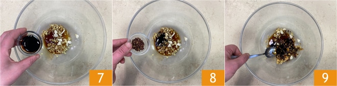 Añade también la salsa hoisin 7, la pimienta de Sichuan 8 y mezcla todo 9.