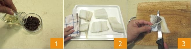 Para preparar la terrina de bacalao con salsa de manzanas, empezad enjuagando las pasas bajo agua corriente, luego ponedlas a rehidratar en un cuenco con el vino blanco 1: dejad así por al menos 30 minutos. Luego, tomad el bacalao desalado (si tenéis bacalao salado, seguid nuestra escuela de cocina: Cómo desalar el bacalao) y pasadlo rápidamente bajo un chorro de agua fría: luego secadlo bien 2. Quitadle la piel al pescado con la hoja afilada de un cuchillo 3,
