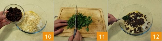 Incorporad las pasas a los demás ingredientes 10. Picad finamente el perejil bien enjuagado y seco 11 y añadidlo también al bol pequeño 12.