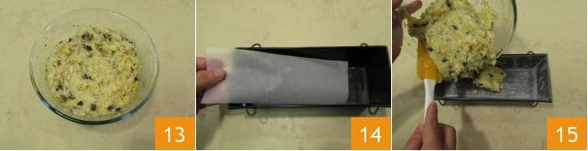 Mezclad bien los ingredientes con un tenedor para obtener una mezcla homogénea 13. Ahora engrasad un molde para plumcake de 27x10 cm y 7 cm de alto y forradlo con papel de horno 14: podéis recortar tiras de papel de horno del grosor y longitud del fondo y los lados del molde, de modo que no queden espacios descubiertos. Transferid la mezcla obtenida 15, nivelándola con una espátula.