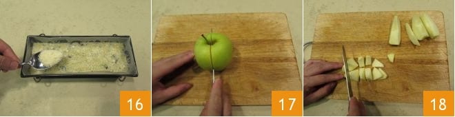 Espolvoread con el queso rallado 16 y hornead en horno estático precalentado a 170°C durante 50-55 minutos (si usáis un horno ventilado será suficiente a 150°C durante 40-45 minutos). Mientras la terrina de bacalao está en el horno, dedicad un momento a la salsa de manzanas: cortadlas por la mitad 17 y peladlas. Cortadlas en gajos y luego en cubitos 18.
