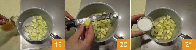 Ponedlas en una sartén antiadherente y añadid el vino blanco que habíais usado para remojar las pasas 19: dejadlo evaporar a fuego medio. Cuando el vino se haya evaporado, pelad el jengibre con un pelador de verduras y rallad su piel directamente en la sartén 20. Cocinad a fuego moderado durante unos minutos, luego añadid el azúcar 21.