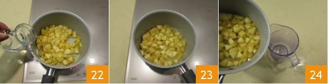 Añadid también el agua y dejad cocinar durante unos minutos hasta que el agua se haya casi totalmente absorbido 23. Continuad mezclando para integrar los ingredientes y sabores. Las manzanas al final de la cocción deben resultar bien cocidas y muy blandas. Luego, transferidlas a un recipiente estrecho y de bordes altos 24.