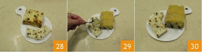 Podéis decidir servir la terrina de bacalao cortando algunas rebanadas 28 y colocando sobre ellas y sobre la terrina misma la salsa de manzanas 29. ¡Vuestro bacalao con salsa de manzanas está ahora listo para ser llevado a la mesa y disfrutado 30!