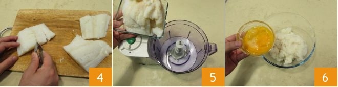 eliminad las espinas 4 ayudándoos con unas pinzas de cocina y colocadlo en la batidora 5 para triturarlo. Transferid el bacalao desmenuzado a un bol grande al que añadiréis las yemas batidas 6.