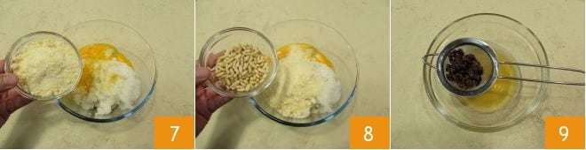Agregad también el queso rallado 7 y los piñones 8. Después escurrid las pasas y guardad el vino a un lado 9.