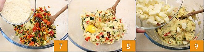 Mientras tanto, limpie y corte en pequeños cubos las verduras 4 (zanahorias, espárragos, calabacines, pimientos), luego agréguelas al cebollino y déjelas rehogar, a fuego bajo, hasta que estén tiernas 5. Al finalizar la cocción, rectifique de sal, deje templar y una a las patatas 6.