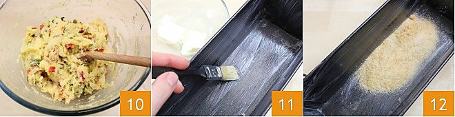 luego mezcle todo muy bien 10. Unte con mantequilla un molde de plumcake de dimensiones 27x10 cm 11 y cúbralo con pan rallado 12;