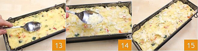 vierta la mezcla a base de patatas en el molde, nivélela con la ayuda de una cuchara 13 y espolvoree con el queso rallado reservado 14. Hornee en horno estático durante 50 minutos a 180° 15. Una vez listo, desmolde la terrina mil sabores y sírvala aún caliente.