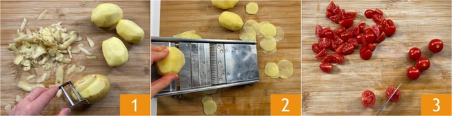 Para preparar la tiella barese (arroz patatas y mejillones), lo primero que debe hacer es pelar las patatas 1 y cortarlas en rodajas de 5 mm de grosor con ayuda de una mandolina 2. Lave los tomates cherry y divídalos por la mitad o en cuartos, según su tamaño 3.