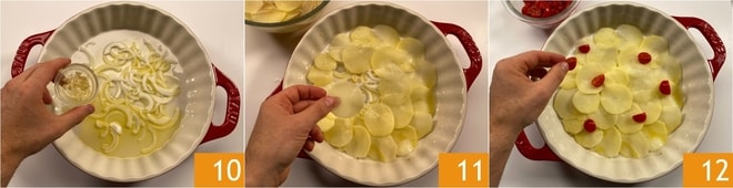 Está listo para ensamblar la tiella: tome un molde de unos 28 cm de diámetro (lo ideal es usar una cazuela de barro o cerámica) y engrase el fondo, luego distribuya aproximadamente la mitad de la cebolla y el ajo 10. Coloque la mitad de las patatas en la base para formar la primera capa 11, luego añada algunos tomates cherry 12.