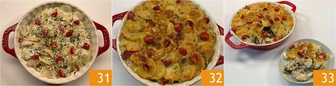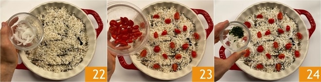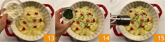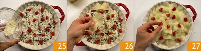 Espolvoree nuevamente con Pecorino 25. Forme la última capa colocando las patatas sobre toda la superficie 26, luego añada los tomates cherry restantes 27 y perejil.