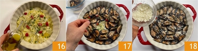 Sazone con un hilo de aceite 16, luego coloque los mejillones con la parte de la concha hacia abajo para formar la segunda capa 17. Espolvoree nuevamente con un poco de Pecorino 18.
