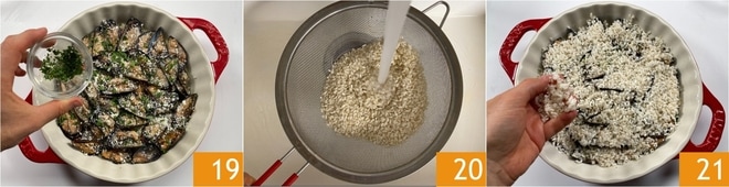 Sazone con más perejil 19, sal y pimienta. En este punto, lave bien el arroz bajo agua corriente 20, luego distribúyalo sobre los mejillones cubriéndolos uniformemente 21.