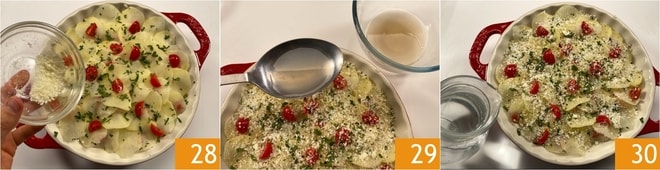 Cubra todo con abundante Pecorino 28, luego sazone con sal y pimienta. Finalmente, humedezca la bandeja con el agua filtrada de los mejillones, cuidando de verterla a lo largo de los bordes 29. Añada también agua de esta manera, la cantidad suficiente para que casi llegue al nivel de la última capa de patatas 30.