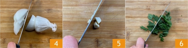 Limpiar y cortar la cebolla en rodajas finas 4, luego hacer lo mismo con el ajo 5. Finalmente, pique los manojos de perejil 6.