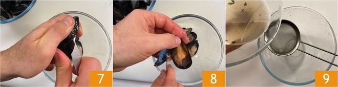 Ahora encárguese de la Cómo limpiar y abrir los mejillones en crudo: quite el biso y frote la concha con un estropajo, luego inserte la punta de un cuchillo afilado entre las valvas y deslícela a lo largo del lado plano del mejillón. Empiece desde la punta y continúe hasta llegar al otro extremo 7, luego raspe siempre con la punta del cuchillo para desprender el molusco de una de las valvas. Descarte la mitad vacía de la concha y reserve la mitad con el molusco aún adherido 8. Realice esta operación colocando un bol debajo para recoger el agua de los mejillones, después fíltrelo 9 y resérvelo.