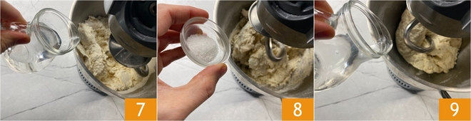Cuando los ingredientes comiencen a mezclarse, aumentad ligeramente la velocidad de la batidora y verted el agua poco a poco 7. En este punto, añadid la sal 8 y continuad vertiendo el agua en hilo 9, asegurándoos de que sea bien absorbida por la masa.