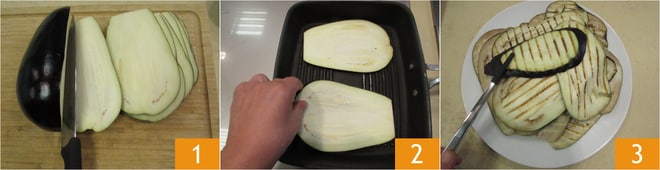 Para preparar el timbal de arroz con berenjenas y tomates, primero lava las berenjenas y córtalas en rodajas de aproximadamente 3-4 mm de grosor 1. Asa las berenjenas en una parrilla caliente 2 y resérvalas 3.