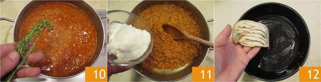 Sazona con sal, deshoja el tomillo y lleva el arroz a cocción 10. Al final de la cocción retira del fuego y mezcla con el queso parmesano 11 y el aceite. Ahora toma un molde acampanado de 24 cm de diámetro en la base, 21 cm en la parte superior y con un borde alto de 5 cm. Unta el molde con aceite y coloca las berenjenas a la parrilla en forma de abanico 12.