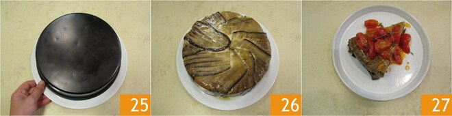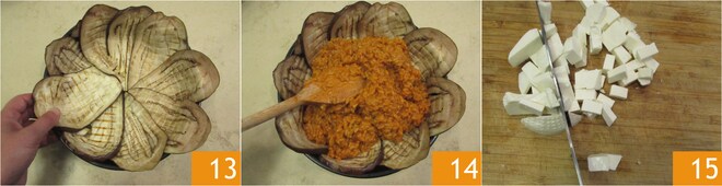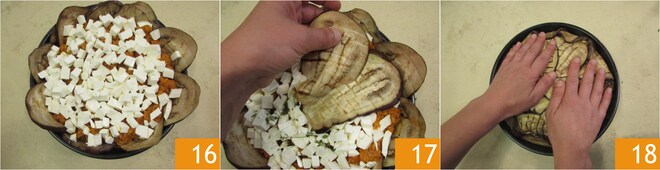 Rellena con el queso en cubos 16; luego coloca más rodajas de berenjena para cubrir todo el relleno 17, dobla las berenjenas para cubrir completamente el arroz y obtener una tarta 18, presiona con las manos o con un plato.