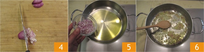 Pica finamente la chalota 4. Vierte el aceite y la chalota en una cacerola ancha 5 y rehoga a fuego lento durante unos 5-6 minutos 6.