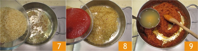 Vierte el arroz 7 y tuéstalo durante unos minutos. Añade el puré de tomate y mezcla 8. Comienza a cocinar el arroz con caldo de verduras caliente, añadiendo 1-2 cucharones según sea necesario 9.