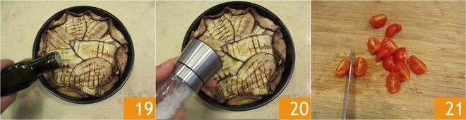 Unta con aceite 19 y sal las berenjenas 20. Cocina en horno estático precalentado a 200° durante 15 minutos. Deja enfriar a temperatura ambiente. Mientras tanto, prepara los tomates cherry. Como primer paso, lávalos y córtalos en cuartos 21.