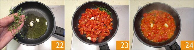 En una sartén calienta un poco de aceite con ajo y tomillo 22. Vierte los tomates 23, sazona con sal y cocina durante unos 8-10 minutos a fuego medio 24.