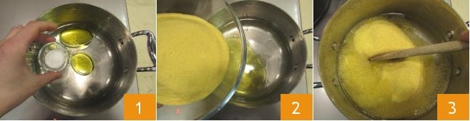 Para realizar el timbal de polenta y cotechino necesitaréis un cotechino ya cocido; si no disponéis de uno sobrante, podéis realizarlo siguiendo nuestras indicaciones que encontraréis en la receta del cotechino con lentejas. Ocupaos entonces de la preparación de la polenta: en una cacerola de borde alto, verted el agua, junto con el aceite y la sal 1, y calentadla bien. Añadid la harina a la cacerola en forma de lluvia 2 y mezclad bien con una cuchara de madera para evitar la formación de grumos 3.