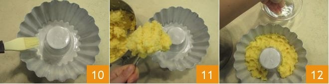 Engrasad un molde de corona de 20 cm de diámetro y 8 cm de alto, ayudándoos con un pincel para untar bien todo el borde ondulado 10. Ahora verted parte de la polenta en el fondo y en los bordes 11, presionándola con los dedos ligeramente humedecidos 12.