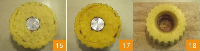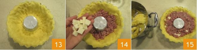 Después de haber revestido todo el molde 13, rellenad el interior con el cotechino y el queso 14 y cubrid con la polenta restante 15.