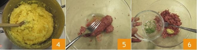 Deberéis obtener una polenta bastante densa 4. Poned en un cuenco el cotechino ya cocido y aplastadlo con un tenedor 5 para obtener una especie de ragú, luego condimentadlo con la mostaza, el romero picado 6.
