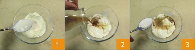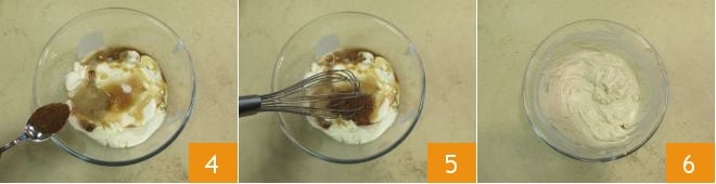 Para preparar el tiramisú a las 5 especias, comenzad por la crema. En un bol, verted el mascarpone, el yogur 1, el café a temperatura ambiente 2 y endulzad con el azúcar 3.