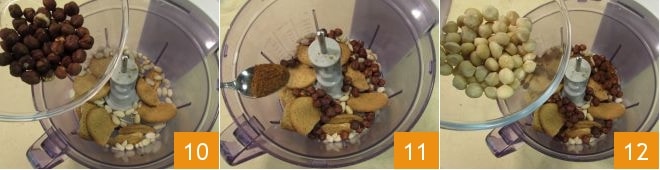 las avellanas 10, la mezcla de especias chinas 11 y finalmente las nueces de macadamia 12.