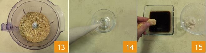 Accionad las cuchillas hasta obtener una mezcla granulosa y un poco gruesa 13. Luego, disponed los vasos y pasad a la composición. Exprimid un poco de crema en el fondo del vaso 14, luego sumergid durante unos instantes los bizcochos de soletilla partidos en 2 o 3 partes 15;