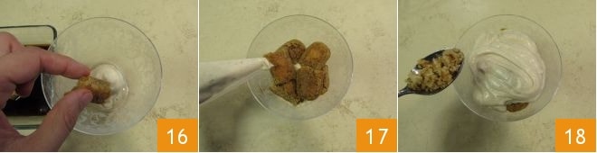 colocadlos en el vaso 16 hasta crear una capa sobre la cual añadir más crema 17. En total, colocad 2 bizcochos de soletilla por vaso. Finalmente, adornad la superficie con una cucharada de crumble 18.