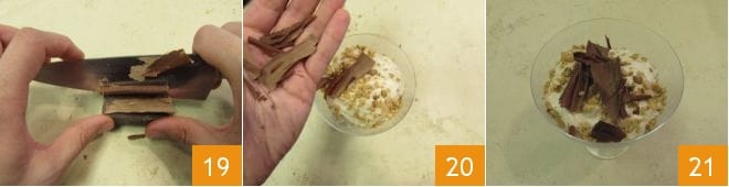 Y unas virutas de chocolate raspadas directamente del bloque de chocolate con la ayuda de una cuchilla 19. Luego, disponedlas en la superficie de cada vaso 20 y vuestro tiramisú a las 5 especias está listo para ser degustado 21.