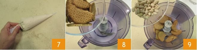 luego transferidlo a una manga pastelera sin boquilla y colocadla un momento en el congelador 7. Pasad al crumble. En la batidora, verted las galletas 8, las almendras 9,