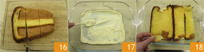 Corta luego cada rebanada en 3 tiras largas 16. Ahora comienza a montar el tiramisú: toma una fuente de 28x22 cm y realiza una primera capa fina de crema 17. Coloca encima las rebanadas de pandoro de modo que la llenes completamente, puedes cortar pequeños trozos y añadirlos en los espacios vacíos 18.