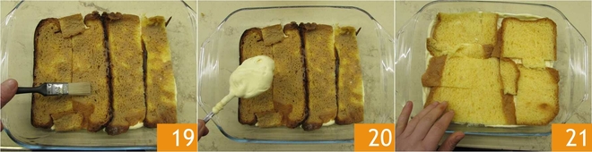 Ahora, utilizando un pincel de cocina, humedece el pandoro con el remojo preparado anteriormente 19. Agrega una capa de crema, esta vez más abundante 20 y realiza nuevamente otra capa de pandoro 21.