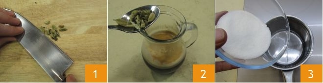 Para preparar el tiramisú al cardamomo, primero corta por la mitad las vainas de cardamomo 1, prepara el café de la moka, añade aquí el cardamomo 2 y deja en infusión durante toda la noche. Al día siguiente, dedícate al resto de la preparación, empezando con la crema de mascarpone: vierte en un cazo el agua y añade el azúcar granulada 3, mezcla para humedecer bien el azúcar y calienta a fuego moderado hasta llevar el jarabe a una temperatura de 121°C (para controlar mejor la temperatura, equípate con un termómetro para alimentos); si no tienes termómetro, el jarabe estará listo cuando se formen pequeñas burbujas blancas en la superficie.