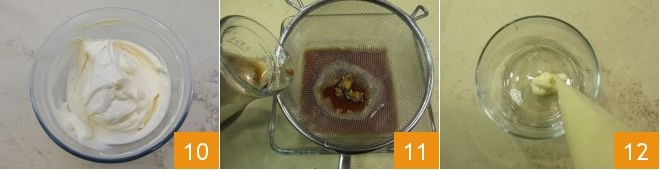 hasta obtener una crema homogénea 10. Todo está listo para componer el tiramisú al cardamomo: filtra el café con un colador 11, transfiere la crema de mascarpone a una manga pastelera, exprime un poco de crema en el fondo del vaso para crear una primera capa 12.