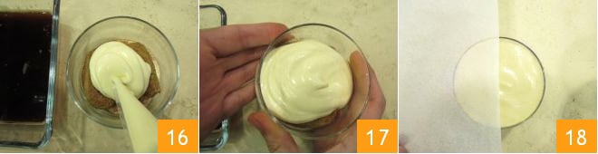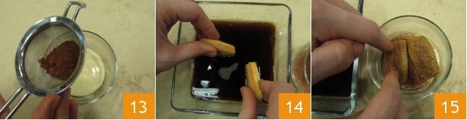 Espolvorea la superficie con cacao amargo en polvo 13, ahora rompe los bizcochos de soletilla, sumérgelos en el café para empaparlos 14, luego colócalos en el vaso 15.