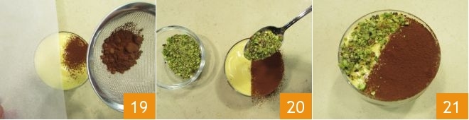 y espolvorea el cacao en la parte no cubierta 19, decora la otra mitad con el granillo de pistachos 20. El tiramisú al cardamomo está listo para ser disfrutado 21.