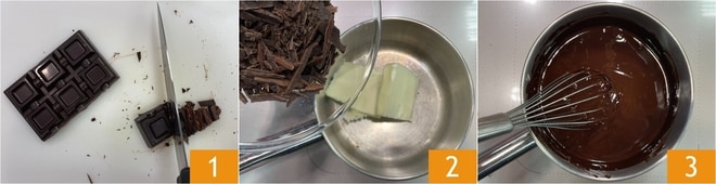 Para preparar el tiramisù brownie, comienza con la masa del brownie: pica el chocolate negro con un cuchillo 1, colócalo en un cazo con la mantequilla 2 y deja que se derrita todo a fuego muy bajo, mezclando con una varilla 3.