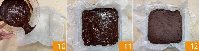 Vierte la masa obtenida en un molde de 20x20 cm, forrado con papel de horno 10, y hornea en horno estático precalentado a 190° durante unos 25 minutos 11. Una vez cocido, saca el brownie del horno y deja que se enfríe 12.