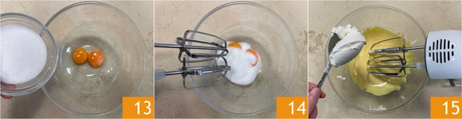 Mientras tanto, dedica tu atención a la crema de tiramisù: separa las yemas de las claras en 2 boles. Añade el azúcar a las yemas 13 y bate con las varillas 14. Cuando hayas obtenido una mezcla cremosa, agrega el mascarpone 15.