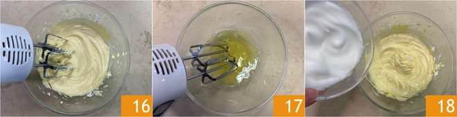 Mezcla de nuevo con las varillas. Ahora monta las claras a punto de nieve 17 e incorpóralas a la mezcla de yemas y mascarpone 18 moviendo delicadamente la espátula de abajo hacia arriba.