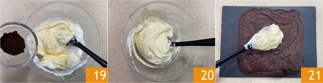 Finalmente, añade el café soluble 19 y mezcla para incorporarlo uniformemente 20. Extiende la crema obtenida sobre la superficie del brownie ya enfriado 21.
